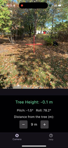 The app uses built-in IMU, gyroscope, and camera to estimate the vertical angle to the tree top and base.