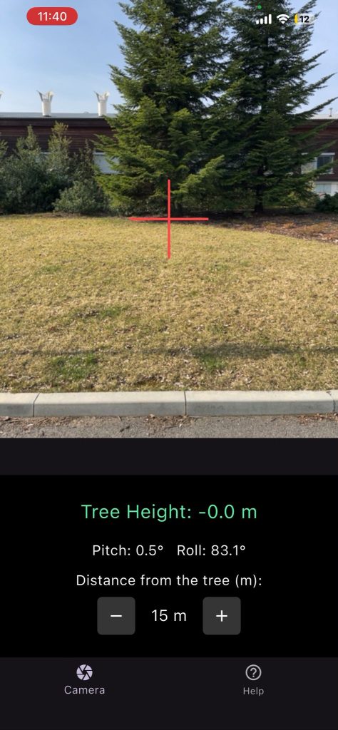 The app uses built-in IMU, gyroscope and camera sensors to estimate the vertical angle and distance to the tree top and base. By combining these measurements, it automatically calculates the total tree height without any external equipment or manual calculation.